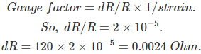 04․ A metal strain gauge has a gauge factor of two. Its nominal resistance is 120 ohms. If it undergoes a strain of 10-5, the value of change of resistance in response to the strain is