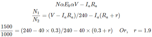 02․ A 240 V dc series motor takes 40 A when giving its rated output at 1500 rpm. Its resistance is 0.3 Ω. The value of resistance which must be added to obtain rated torque at 1000 rpm is