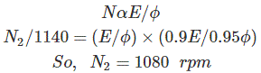 04․ A dc shunt motor runs at a no-load speed of 1140 rpm. At full load, armature reaction weakens the main flux by 5% whereas the armature circuit voltage drops by 10%. The motor full-load speed in rpm is