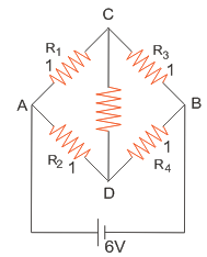 Bridge is balanced i.e node C and D are at same potential. No current flows through 2 KΩ resistor. Balanced bridge can be obtained when R1R4 = R2R3.