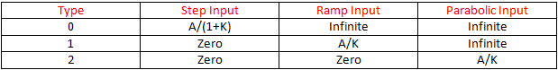 Applying final value theorem, Steady state error = Lts→0 S E(s) Steady state error for different types and different inputs as follows: