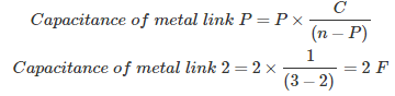 04․ A guard ring is used in string type insulator having 3 units to improve string efficiency. Find the capacitance of metal link 2 if pin to earth capacitance of each unit is 1 F?