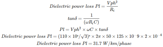 08․ A 3-phase, 110 kV coaxial XLPE insulated power cable delivering power at 50 Hz, has a capacitance of 125 nF/km. If the dielectric loss tangent of XLPE is 2*10^-4, then dielcetric power loss in this cable in W/km/phase is