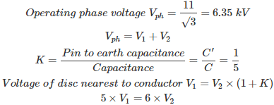 01․ Consider a three phase, 50 Hz, 11 kV distribution system. Each of the conductors is suspended by an insulator string having two identical porcelain insulators. The self capacitance of the insulators is 5 times the shunt capacitance between the link and ground. Find the voltage across the two insulators V1 and V2? (V1 = Voltage of disc nearest to the conductor)
