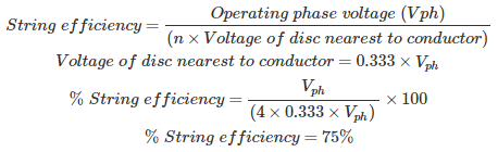 02․ A string insulator has 4 units. The voltage across the bottom most unit is 33.33% of total voltage. Its string efficiency is