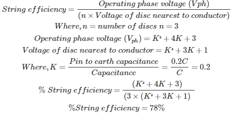03․ A string type insulator has three units with self capacitance C and ground capacitance of 0.2 C having a string efficiency of