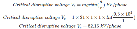 04․ A 1- phase transmission line operating at 30 kV has radius of 1 cm and distance between conductors is 0.5 m. Assume m = δ =1, g = 21 kV/cm and frequency f = 50 Hz. Find the critical disruptive voltage?