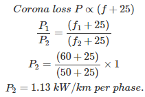 03․ The corona loss on a particular system at 50 Hz is 1 kW/km per phase. What is the corona loss at 60 Hz in kW/km per phase?