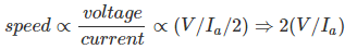 When two DC series motor are connected in parallel then the resultant speed is more than the normal speed. If the voltage across each motor is V and current through each motor in parallel connection is I/2. So