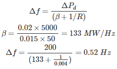 08․ Power system network has a total power of 5000 MW at 50 Hz supplying to the different consumers. Frequency is varying at 1.5% per change of 2% load. Assume R =0.004 Hz/MW. Find the steady state frequency deviation if a sudden loss of 200 MW occur due to tripping of one of the transmission line?
