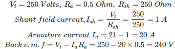 01․ For 250 volt DC Shunt Motor the armature and field resistance are 0.5 ohm and 250 ohm respectively. What will be the back e.m.f. produced when it takes a load current of 21A.