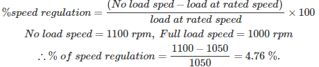 03․ The speed of a motor falls from 1100 r.p.m at no-load to 1050 r.p.m at rated load. The speed regulation of motor is