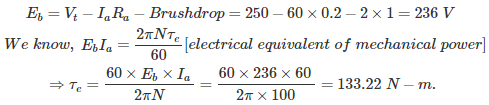 06․ A 250 volt dc series motor having an armature resistance of 0.2 Ω takes a load current of 60 A. What will be the torque produced at the shaft of the motor? Consider brush drop of 1V.
