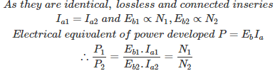 07․ Two identical loss less series motors connected in series across a dc supply voltage, runs at speed of N1 and N2, then ratio of their output power is