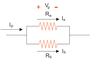 If we connect two resistors in parallel, then the voltage is same across the two resistors and the total current divides into two paths. The current flow through the two parallel connected resistors is shown in below figure.