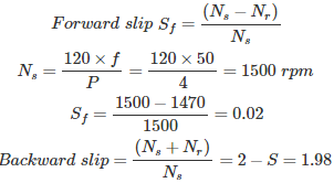 01․ A 4 pole 50 Hz 1-phase induction motor is running at 1470 rpm. Find the forward and backward slips?