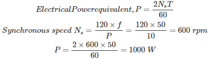 04․ A 440 V, 3-phase, 10 pole and 50 HZ synchronous motor delivering a torque of 50 N-m, delivers a power of