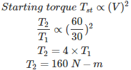 05․ A starting torque of 40 Nm is developed in an induction motor by an auto transformer starter with a tapping of 30%. If the tapping of auto transformer is 60%, then what is the starting torque?