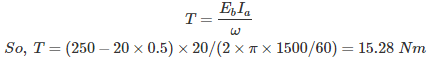 07․ A separately excited DC motor has an armature resistance of 0.5 Ohm. The supply voltage is 250V. Armature current is 20A and the speed of rotation is 1500 rpm. Find the torque developed?