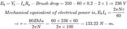 08․ Find the developed torque DC Series Motor having armature resistance of 0.2 Ω and taking armature current of 60 A is connected to 250 V supply. Considered brush drop of 1 V each.