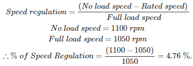 09․ The speed of a motor falls from 1100 r.p.m at no-load to 1050 r.p.m at rated load. The speed regulation of motor is