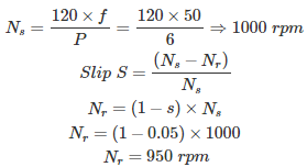 02․ A 3-phase 6 pole 50 Hz induction motor is running at 5% slip.What is the speed of the motor?