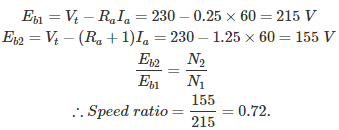 03․ A DC Motor is driving a constant load torque having armature resistance of 0.25 Ω and armature current of 60 A having connected to a voltage of 230 V. Now a resistance of 1 ohm is added into the armature circuit. The ratio of their speed will be