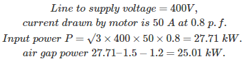 So the speed of rotor w.r.t stator magnetic field is Nr – Ns = 950 - 1000 = - 50 rpm. (-) sign indicates that rotor speed is less than the speed of the synchronous magnetic field speed.05․ A 400 V, 50 Hz, 30 Hp, three phase IM is drawing 50 A current at 0.8 p.f lagging. The stator and rotor copper losses are 1.5 KW and 900 W respectively. The friction and windage losses are 1050 W and core losses are 1200 W. The air gap power of the motor will be