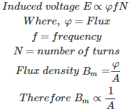In transformer flux density Bm ∝ 1/A