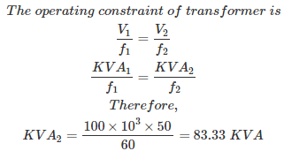 08․ A 100 KVA transformer is operating at 60 Hz, 240 V supply. The same transformer is operating at 50 Hz, 200 V supply. The new rating is