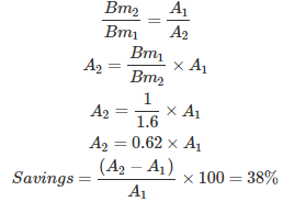 09․ A transformer core is made up of a silicon steel laminations which has maximum flux density 1 Tesla. If it was cold rolled grain oriented its flux density increases to 1.6 Tesla. What is the saving in core size or area due to cold rolled grain oriented process?