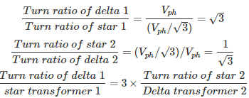 04․ A delta/star transformer is connected in parallel to a star/delta transformer. The turn ratio former is x times latter, the x is