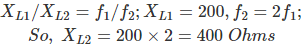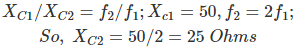 05․ The inductive reactance of an electric circuit is 200 Ohms. The frequency of supply becomes doubled. What is the new capacitive reactance?