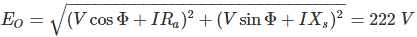 06․ For the above problem, find the induced voltage of an alternator of it is to deliver a load of 100 A at power factor of 0.8 lagging with terminal voltage of 200 V.